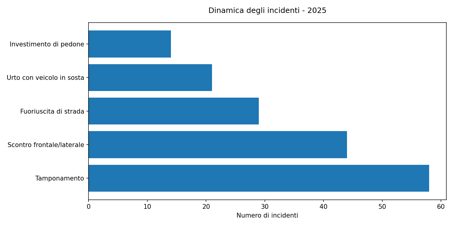 Le dinamiche più ricorrenti negli incidenti rilevati nel 2025 riguardano collisioni tra veicoli, in particolare scontri frontali o laterali e tamponamenti.