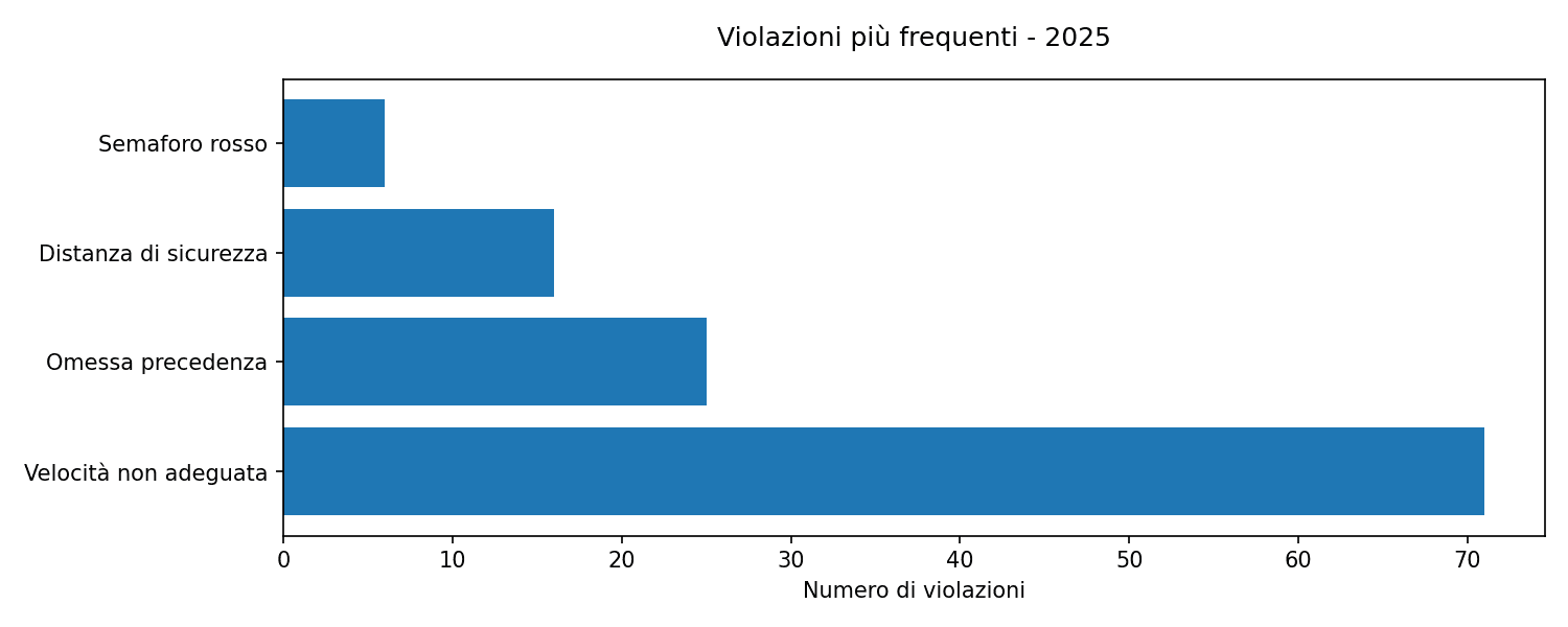 Tra le violazioni al Codice della Strada accertate in relazione agli incidenti, la velocità non adeguata risulta la più frequente, seguita dall’omessa precedenza e dal mancato rispetto della distanza di sicurezza.